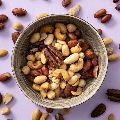 Deze notenmelange bestaat uit gebrande en licht gezouten jumbo pinda's, cashewnoten, grote vlies pinda's, pecannoten, amandelen en hazelnoten.
